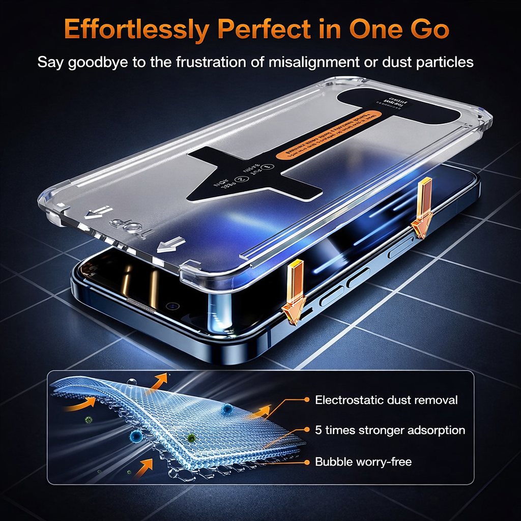 This dust-free installation system gives you a flawless iPhone screen in seconds – perfectly aligned, crystal clear and protected from day one.